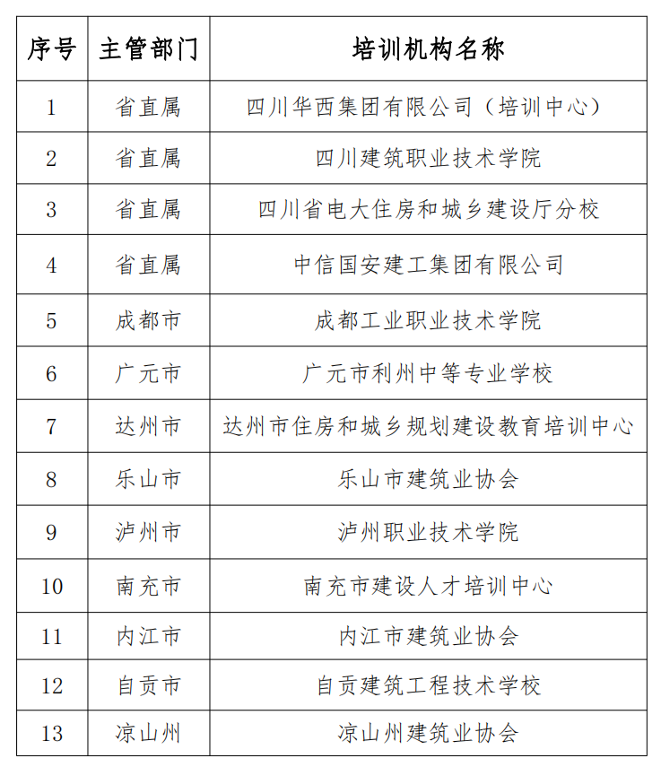 经省、市(州)住房城乡建设主管部门遴选推荐,住房城乡建设部批准,四川建筑职业技术学院等13家单位(附件1)作为首批现场专业人员职业培训试点单位。