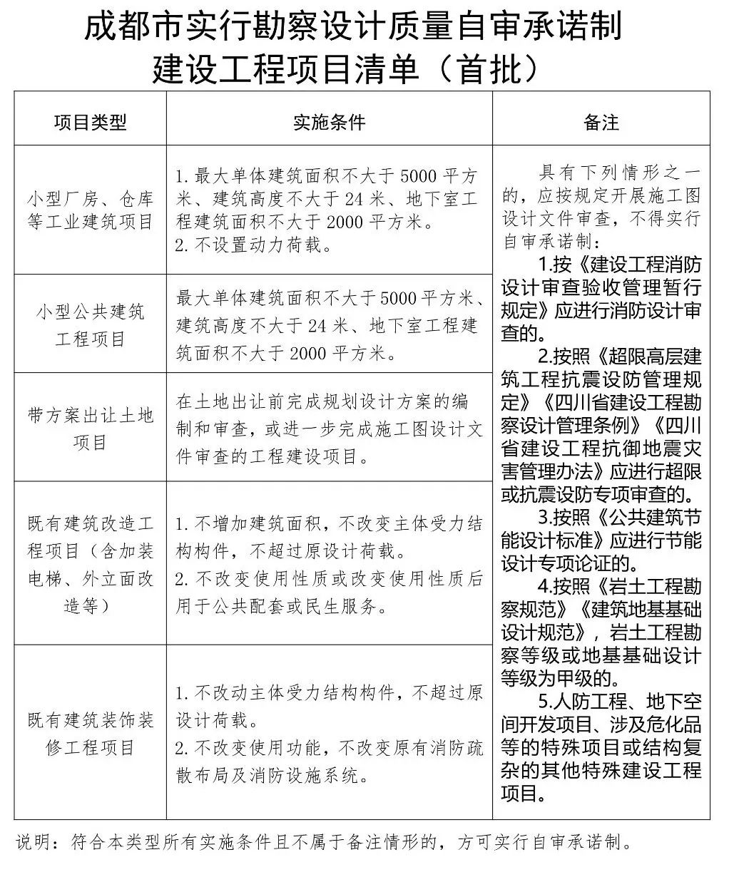 1、适用范围:符合下表中的项目,其勘察、设计单位信用等级均在B级以上的,可实行勘察设计质量自审承诺制,免于施工图设计文件审查,并不再纳入政府购买施工图设计文件审查服务范围。