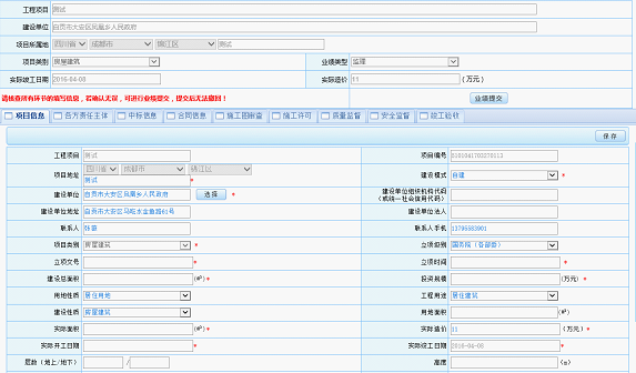 在上图页面填写了基础信息后,点击“确定”按钮进入业绩填报页面,页面显示业绩登记的“项目信息”,分别点击“各方责任主体”、“中标信息”、“合同信息”、“施工图审查”、“施工许可”、“质量监督”、“安全监督”、“竣工验收”图标,并逐一在对话框填写相关信息。如下图所示: