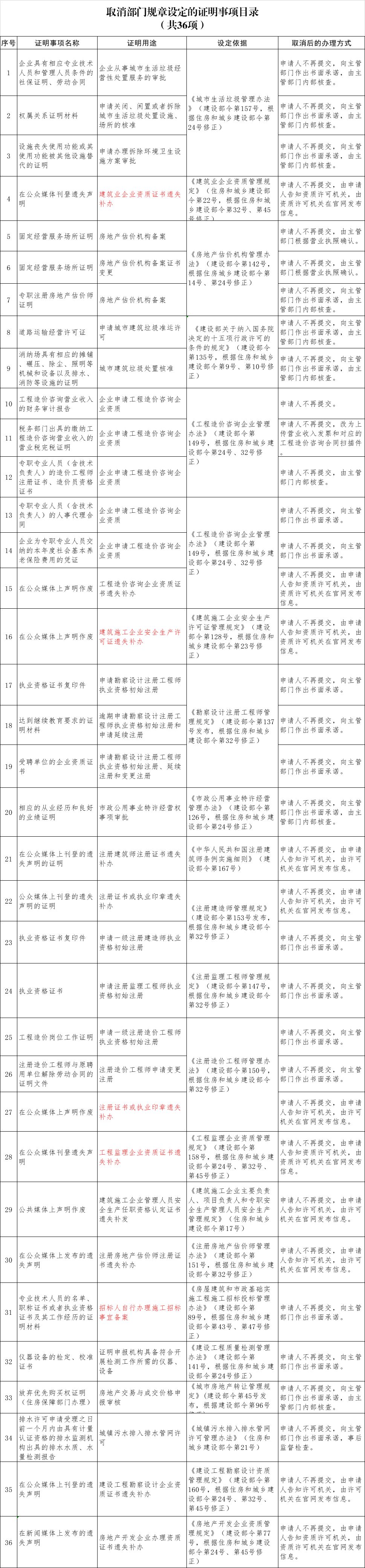 1、取消部门规章设定的证明事项目录