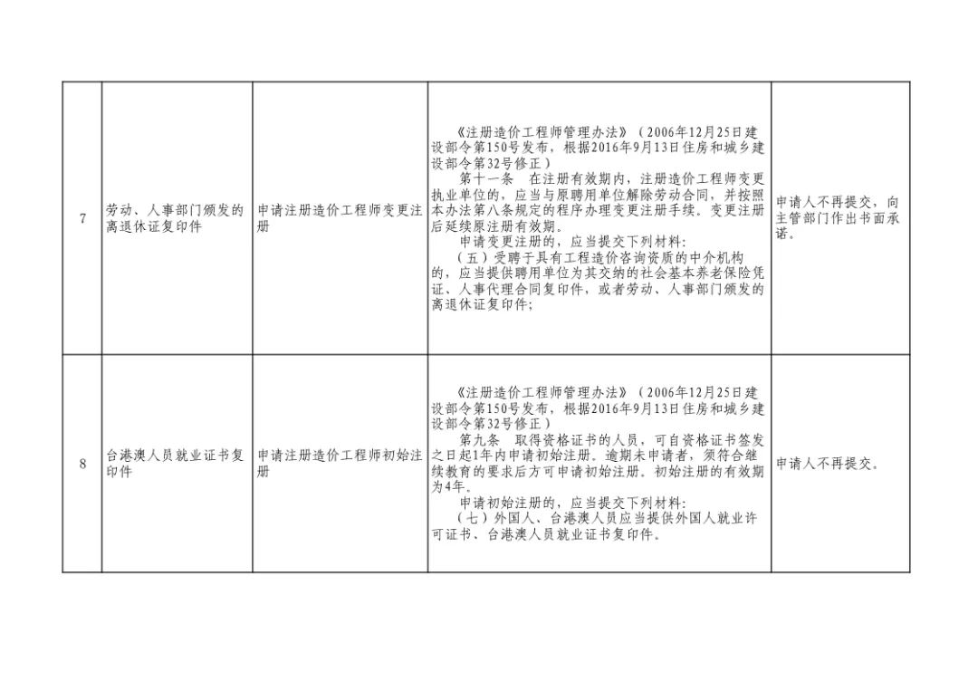 初始注册、变更注册:不再提交社会基本养老保险凭证复印件、劳动/人事部门颁发的离退休证复印件,改为书面承诺;不再提交人事代理合同复印件、台港澳人员就业证书复印件。