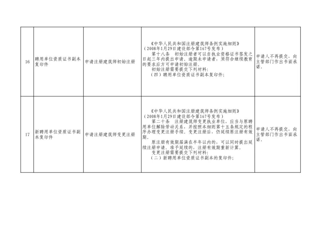 初始注册:不再提交资格证书复印件、相应的业绩证明、聘用单位资质证书副本复印件,改为书面承诺。